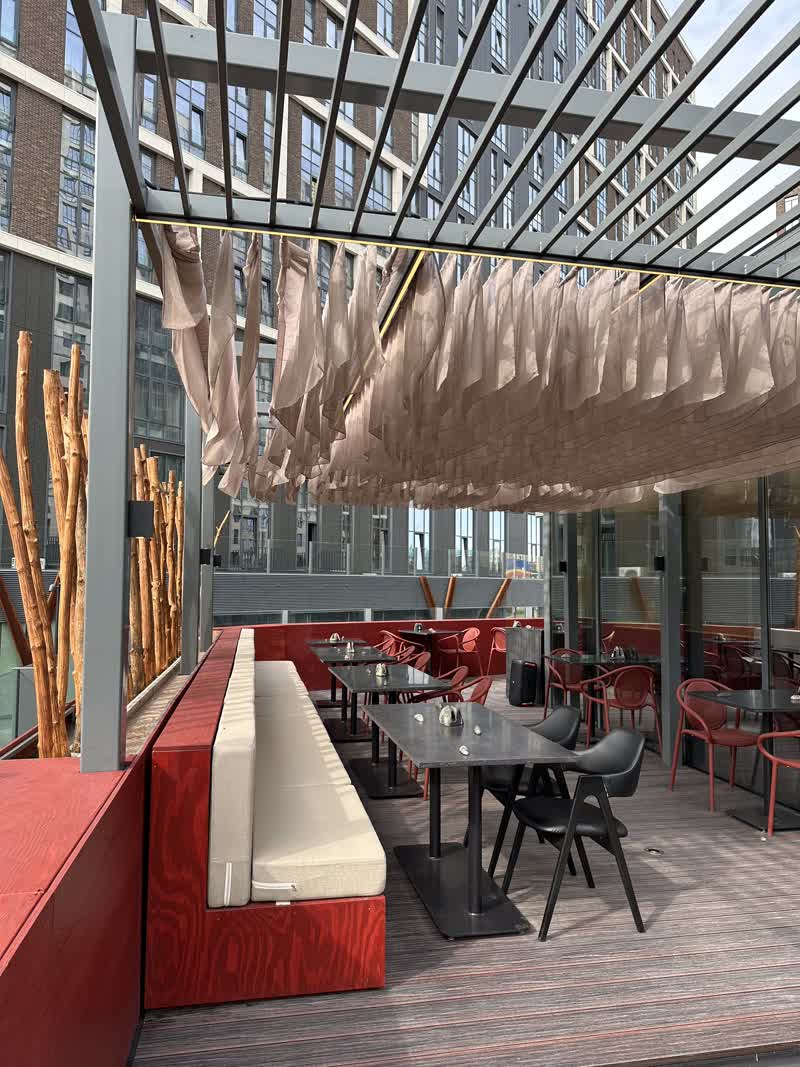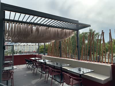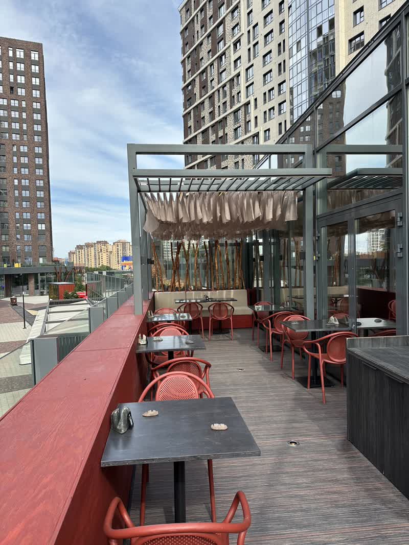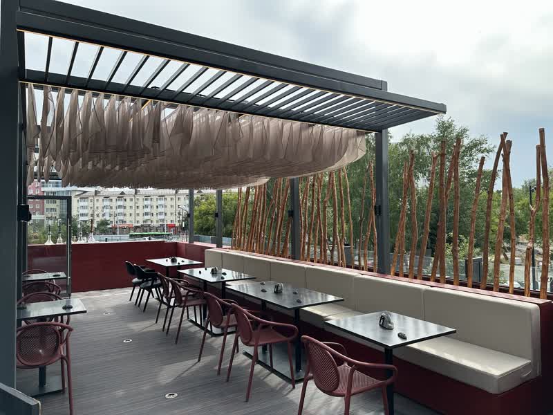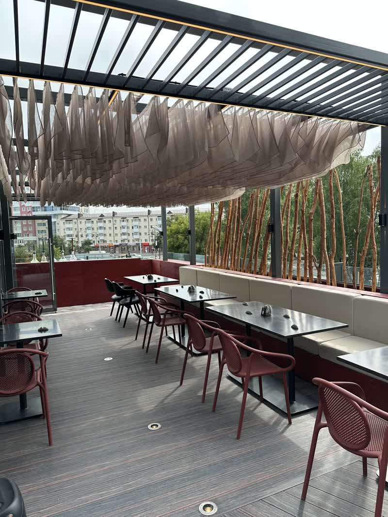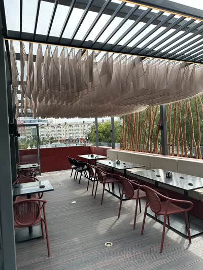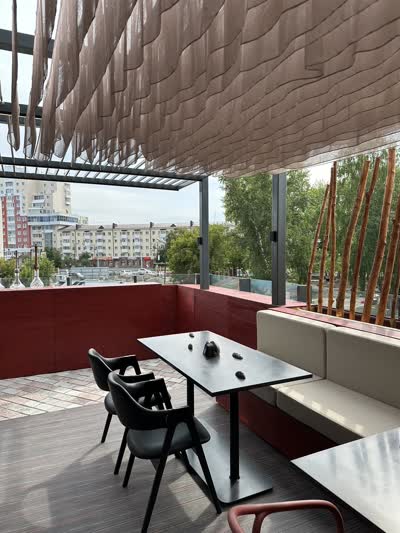 Для террасы ресторана Tate Izakaya были изготовлены следующие элементы: настил из террасной доски, две перголы, клумбы, диваны и стойка кальянщика.