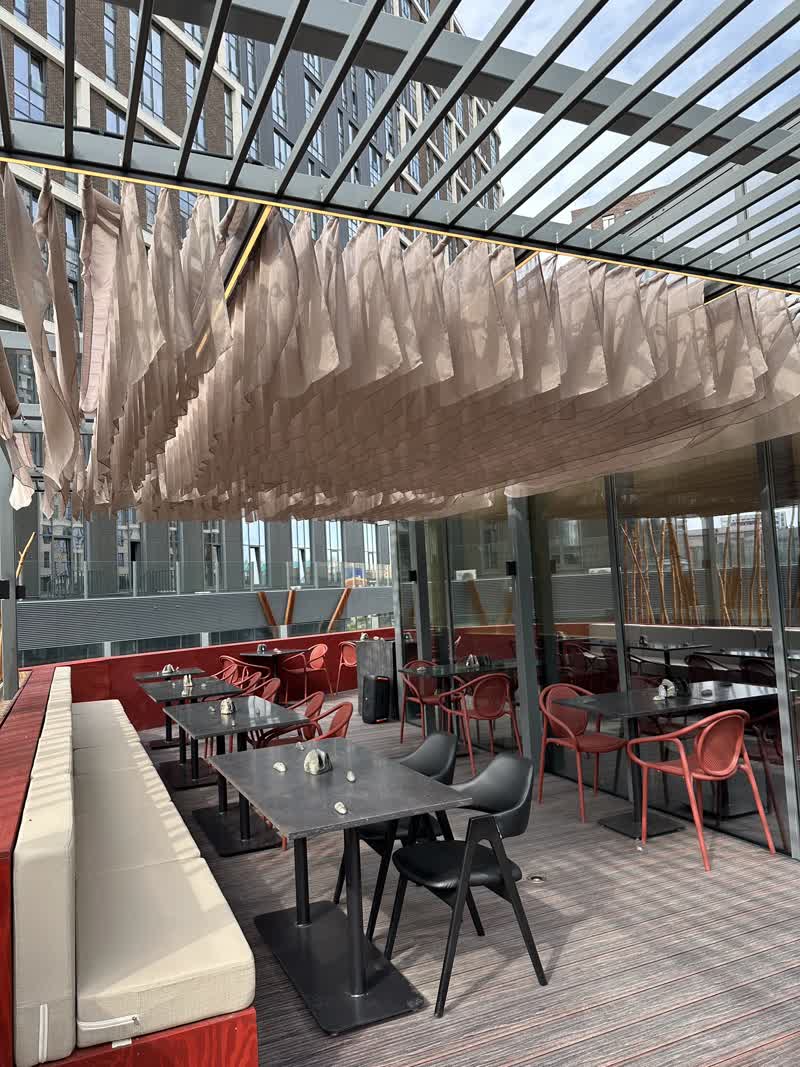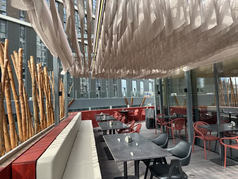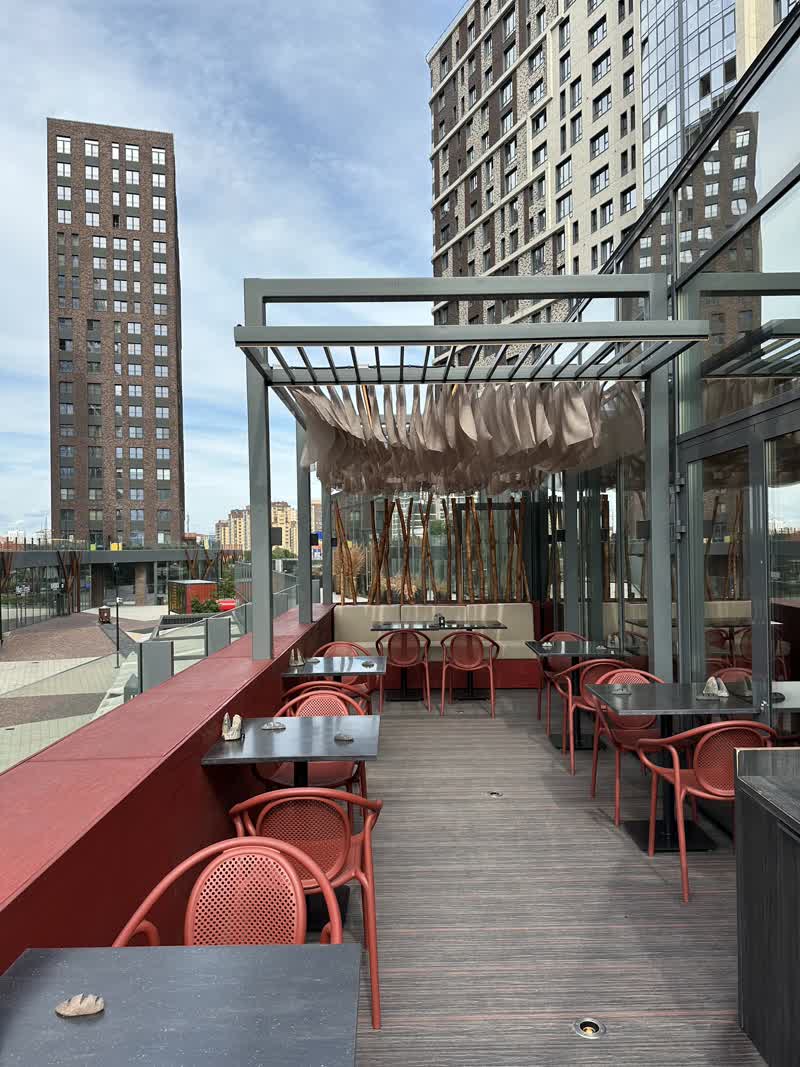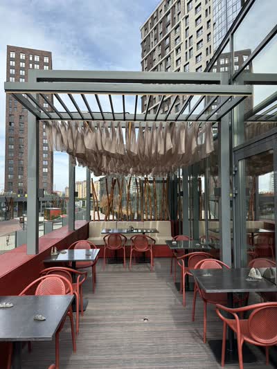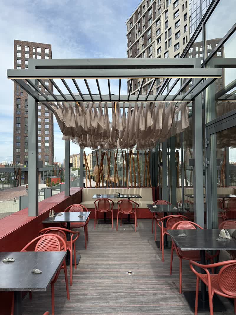 Для террасы ресторана Tate Izakaya были изготовлены следующие элементы: настил из террасной доски, две перголы, клумбы, диваны и стойка кальянщика.