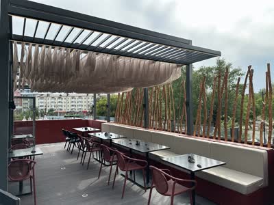 Особенности пергол Перголы оснащены подвесами для крепления полос ткани. Эти ткани при дуновении ветра плавно колышутся, создавая эффект волн и придавая атмосфере террасы динамичность и лёгкость.